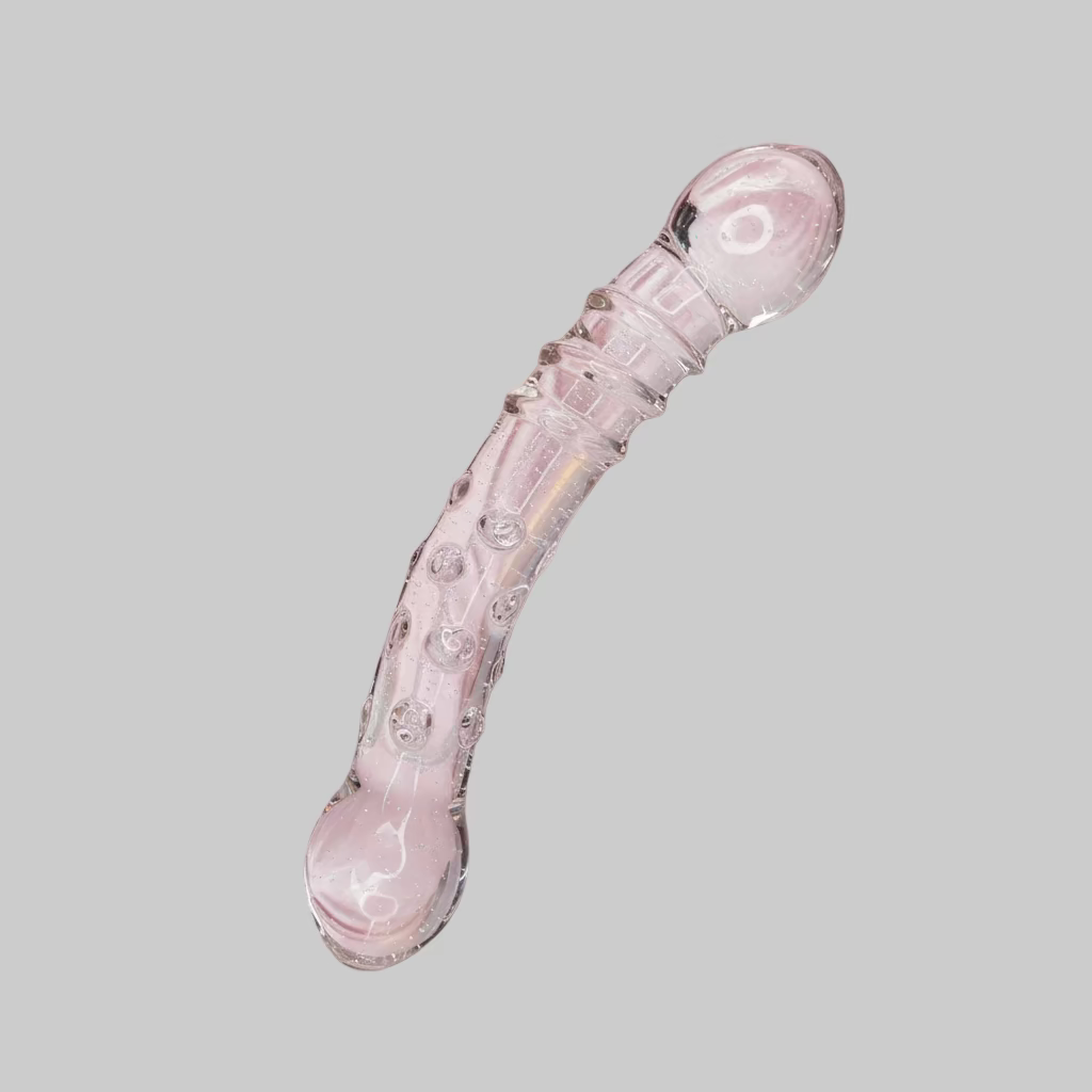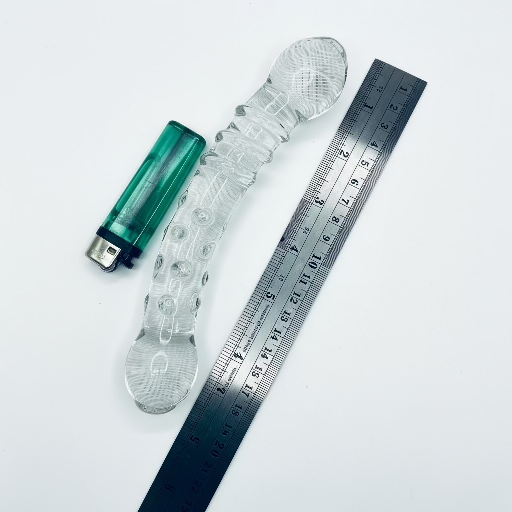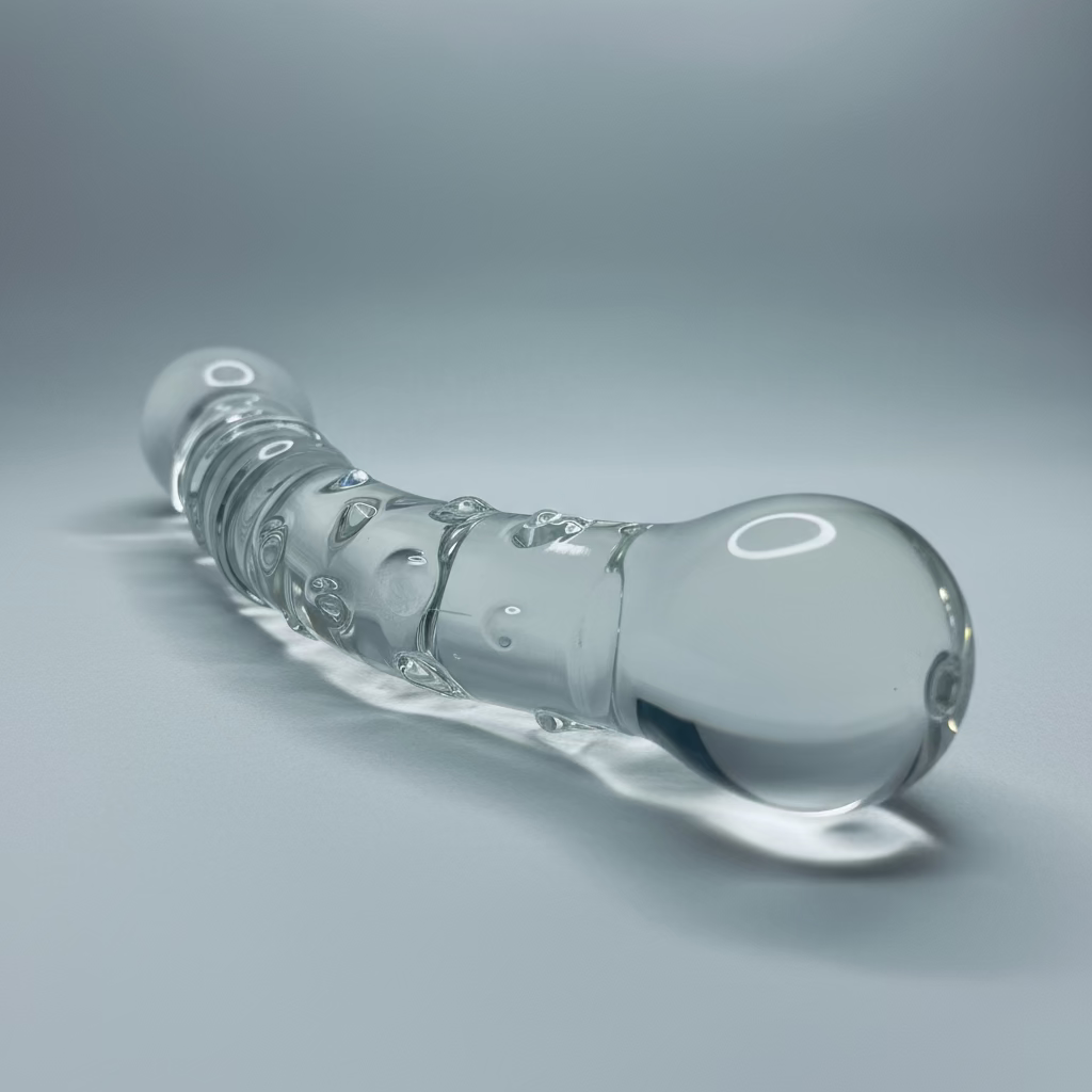 ดิลโด้แก้วมีลักษณะผิวขรุขระ มีปุ่มไม่เรียบ โค้งงอตามภาพประกอบ เพื่อเพิ่มความตื่นเต้นและสัมผัสที่หลากหลาย ข้อดีที่โดดเด่นคือ **ทำความสะอาดง่ายมากๆ** และ **ไม่เป็นแหล่งสะสมเชื้อแบคทีเรีย** จัดเก็บง่าย พกพาง่าย ไม่เปลืองถ่านและไฟฟ้าใดๆ